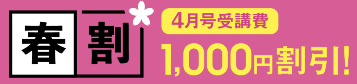4月開講号まずは1ヶ月キャンペーンが開催されています。2023年4月17日までに入会した方が対象です。