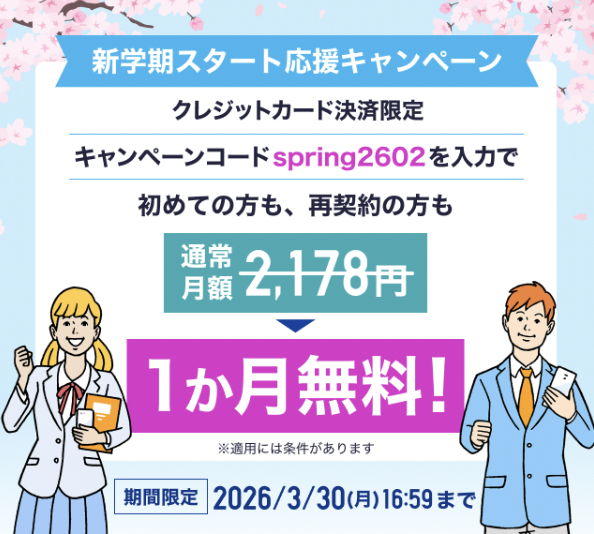今ならキャンペーンコード入力で、1ヶ月無料になります♪